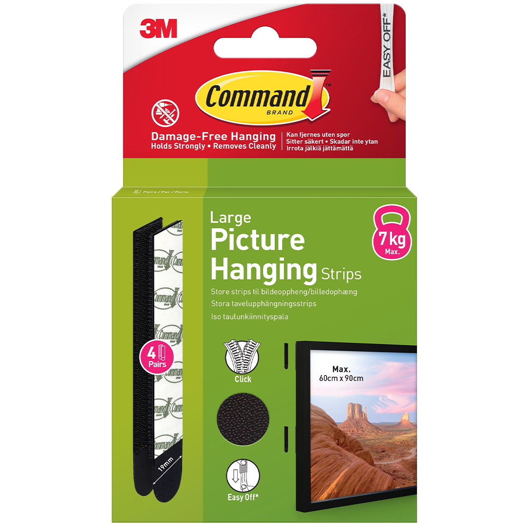 Command Hanging Strips are an innovative solution for safely hanging picture frames and artwork without damaging the wall. No drilling or screwing required. They hold securely and remove cleanly thanks to 3M stretch-release technology. Instructions included. Suitable for most smooth surfaces such as painted walls, metal, and wood.