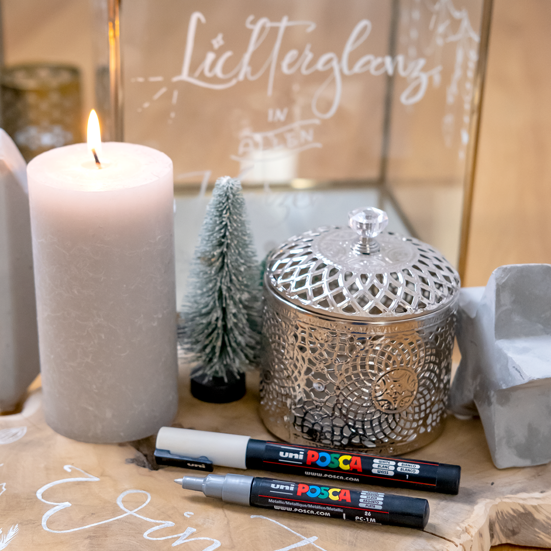 Candle lanterns are true Christmas classics, quietly creating atmosphere night after night. But sometimes they deserve a little extra sparkle. With Posca, which gives strong, opaque colour even on glass, you can quickly transform an ordinary lantern into something personal, graphic or delightfully festive. Try simple lines and dots, small trees around the rim or a frosted pattern that looks like snow.