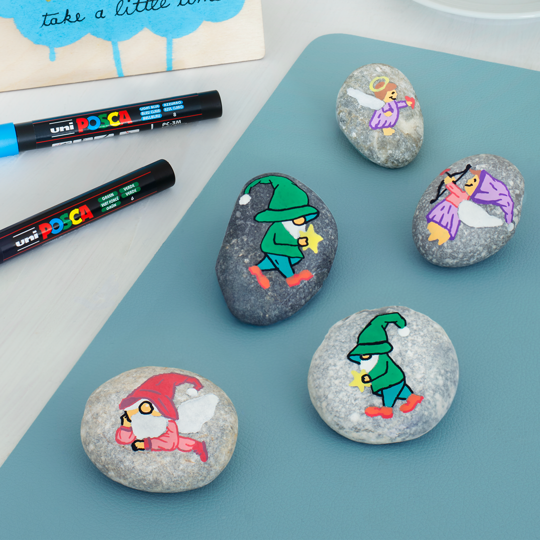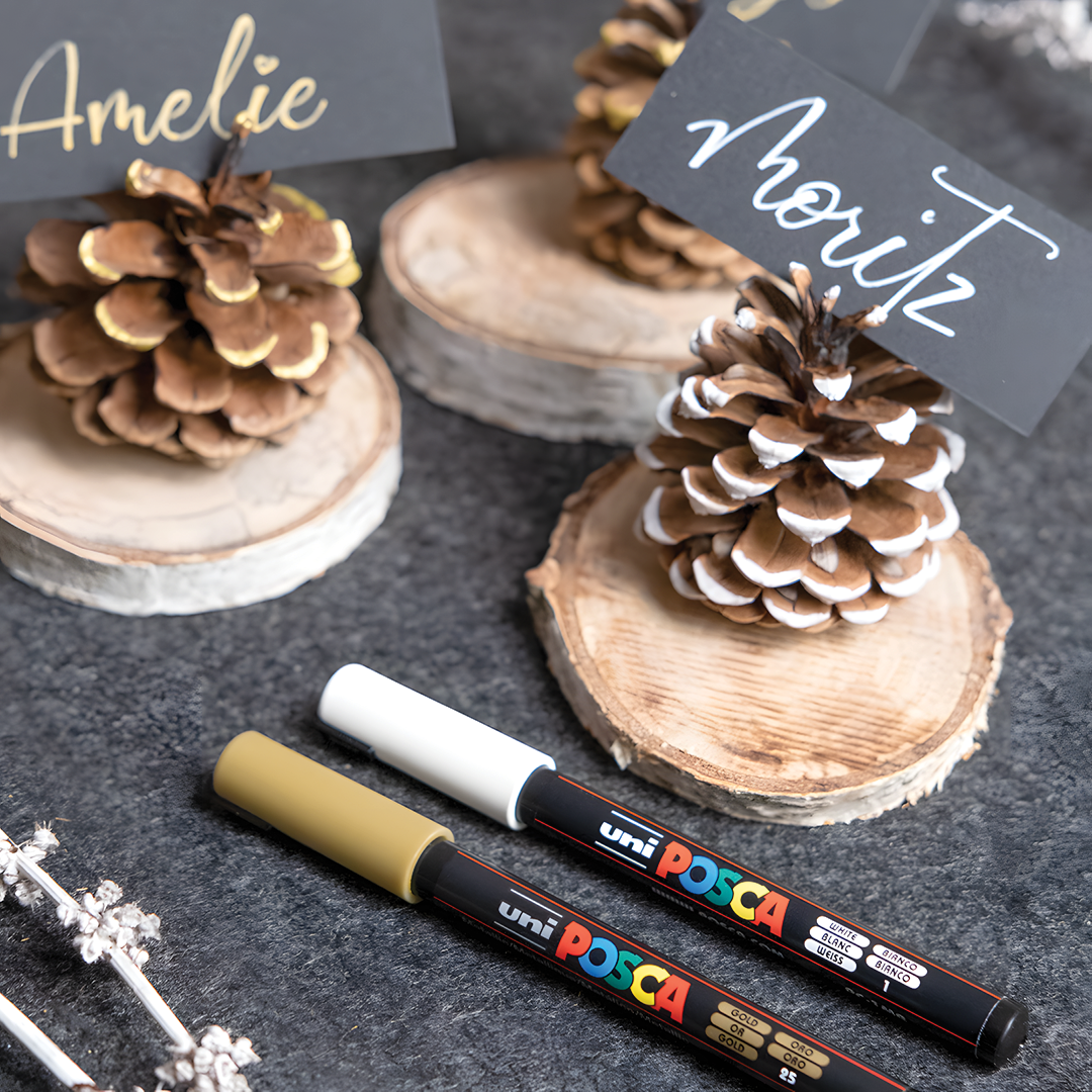 Small stones turn into elves, trees or stars and bring an unexpectedly charming detail among napkins and glasses. Pine cones are also perfect for a makeover. A few strokes of gold or silver make them festive, and if you tuck a small name tag in between the scales, you have place cards that feel simple, thoughtful and wonderfully wintry. If you have other bits and pieces at home, like wooden coasters, game pieces or small glass jars, you can give those a Posca makeover too.