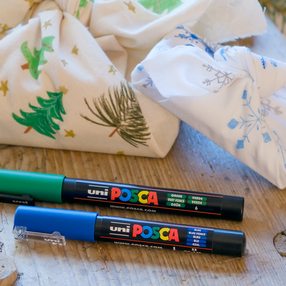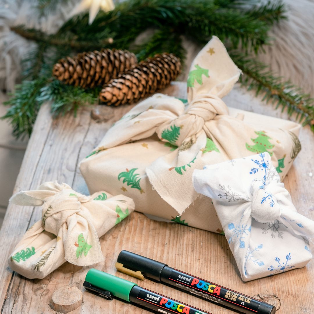Fabric gift wrap has become increasingly popular, and it’s easy to see why. It adds a warm, cosy feel that’s just as thoughtful as the gift itself. With old sheets, tablecloths or leftover fabric from sewing projects, you can create wrap that’s both sustainable and completely unique — and with Posca, it’s simple to add patterns, details and small messages. Bonus: tuck a little decoration into the knot, like a sprig, a flower or a piece of Christmas sweets for extra charm.
