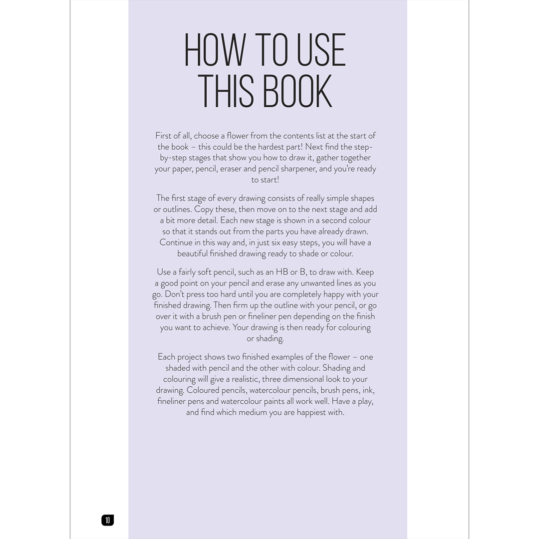 Each flower is broken down into six simple stages that guide you effortlessly towards the finished drawing. There are no written instructions – just basic shapes and pencil strokes. Even if you’ve never drawn before, you’ll be amazed at how quickly you can create beautifully impressive pictures. Each project also shows two finished examples of the flower – one shaded in pencil and one in colour.