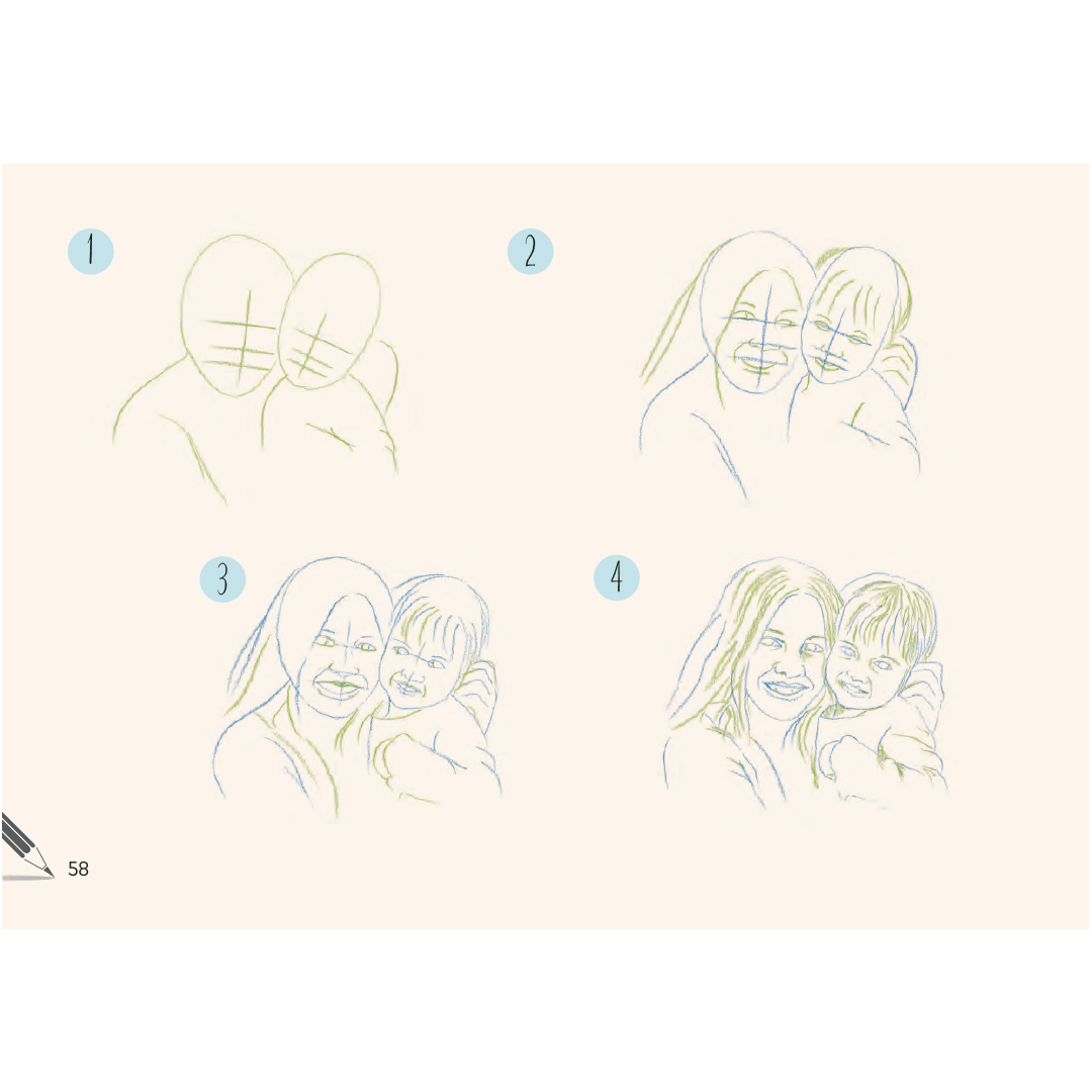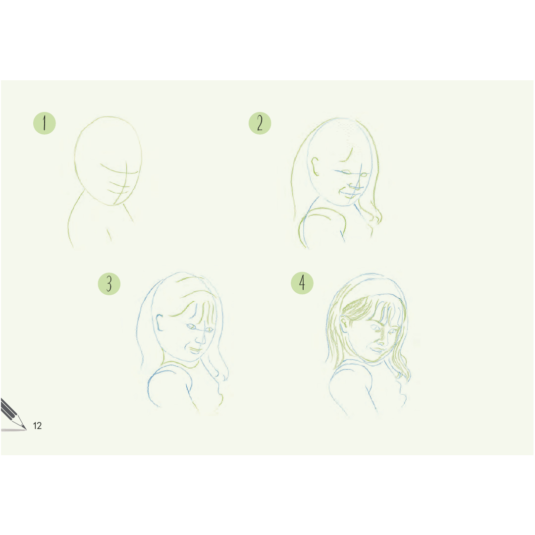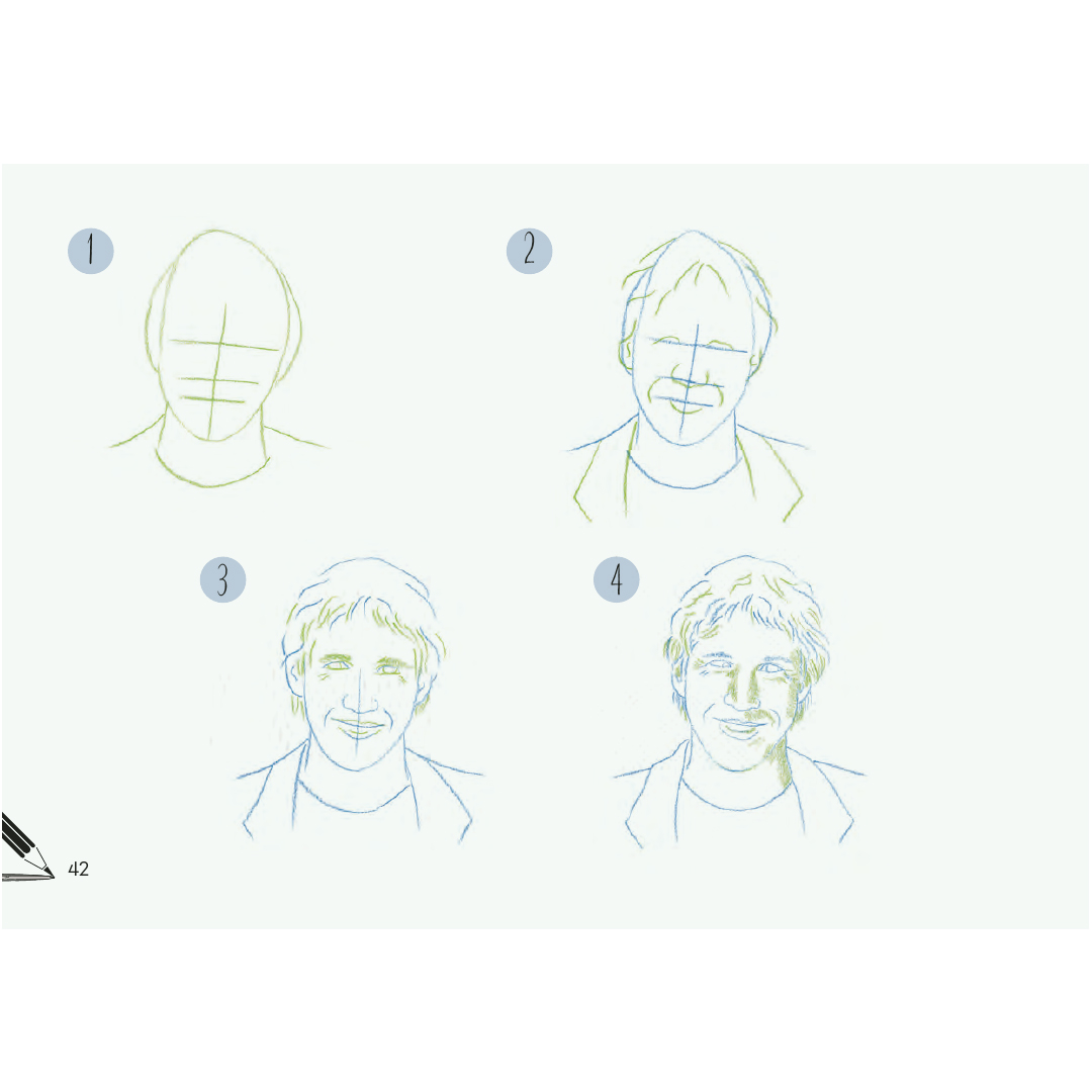 - In no more than 6 easy stages, you'll learn to build up the images gradually from initial geometric shapes right through to the finished face, using a clear, two-colour method that shows exactly how the lines are constructed and then refined.