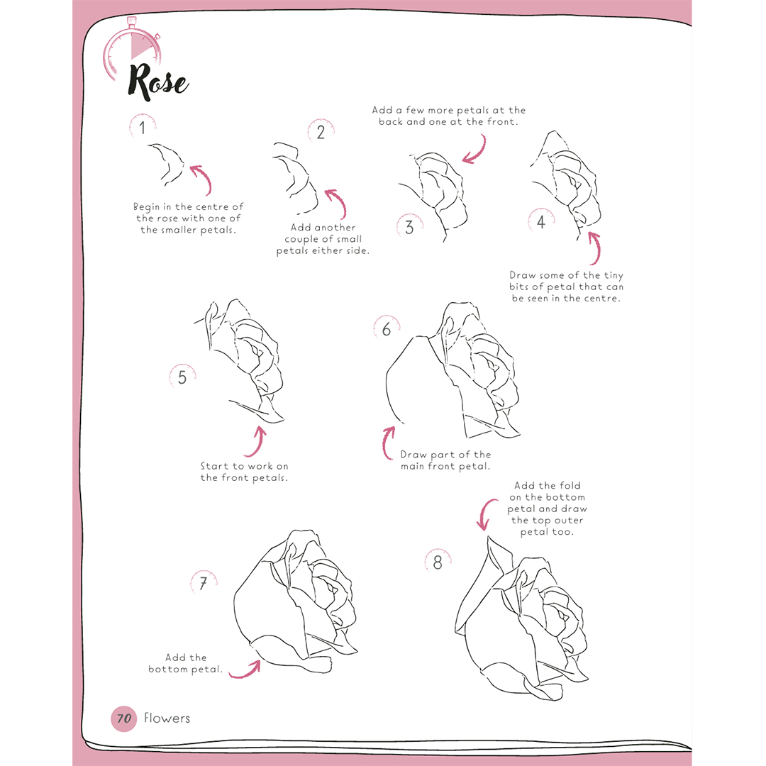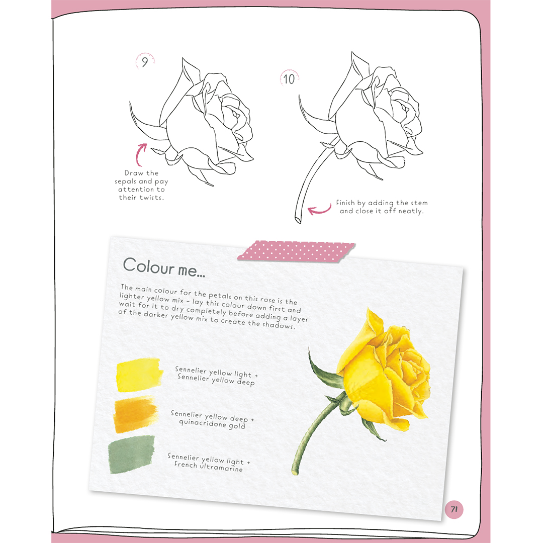 Every project contains between 6 and 10 illustrated steps, simple instructions and an inspirational ‘colour me’ tip box containing colour mixes and advice, in case you’d like to transform your finished drawing with colour in Emma’s case, watercolour paints, but you could use whichever medium you like.