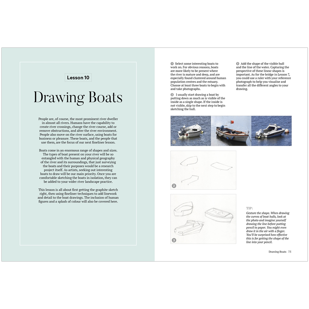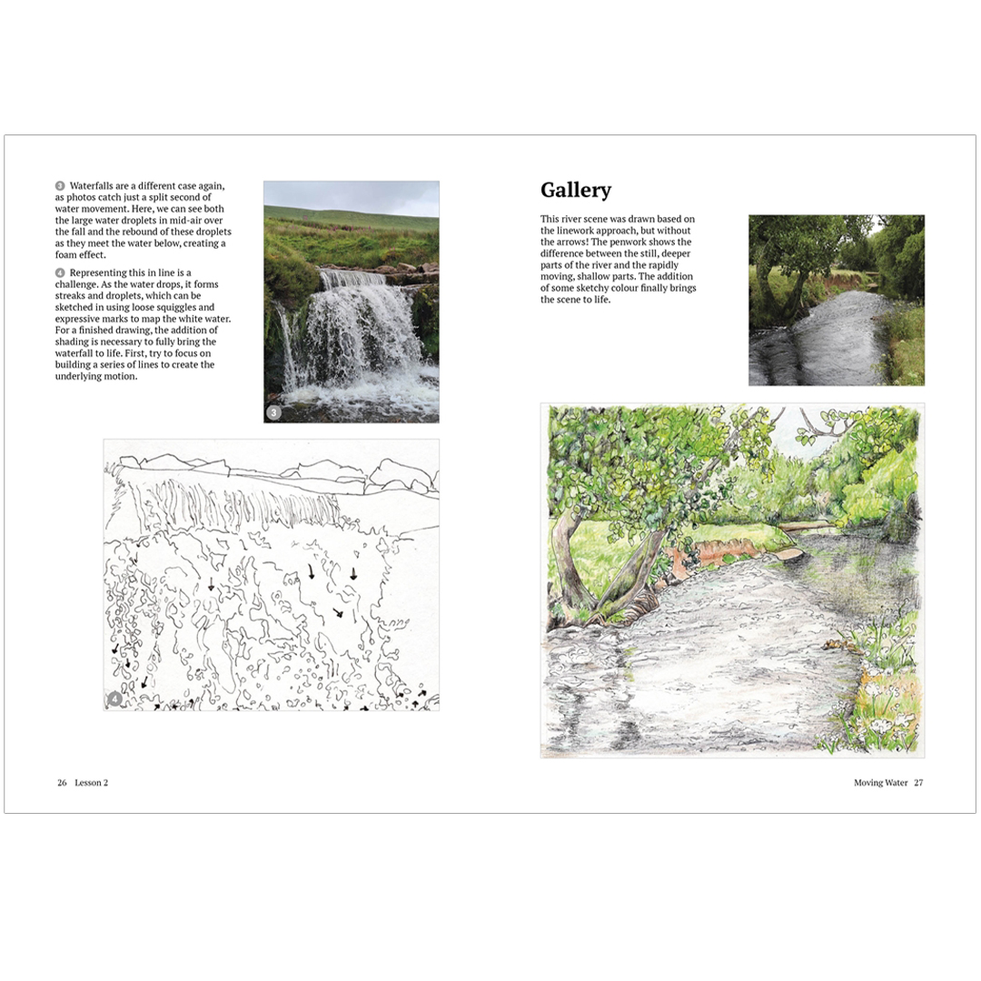 The book is structured as a clear step-by-step course, with each section building your confidence and developing your artistic eye. You’ll learn how to analyse landscape details, build depth and movement in your drawings, and enhance the quality of your artistic expression.