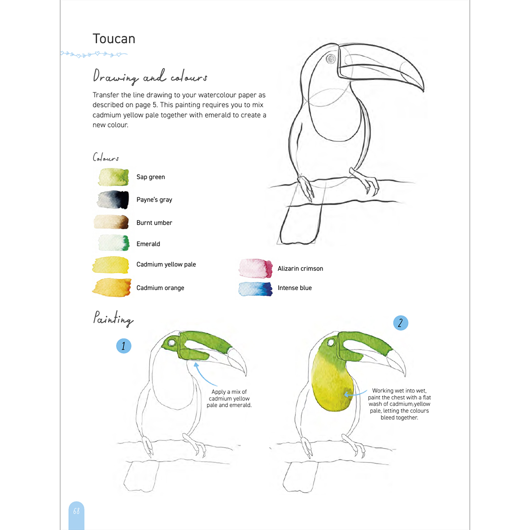 Through 50 easy watercolour projects, you’ll learn how to paint! Each project can be completed in only seven simple steps – from the first outline sketch to the finished artwork – using a small range of colours and straightforward painting techniques.