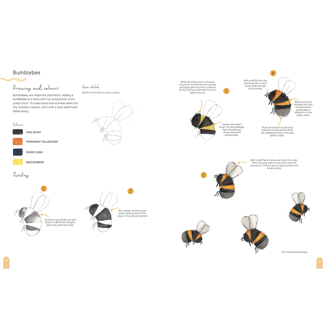 Create colourful, softly blended vignettes of delicate flowers, juicy grapefruit, fluffy bumblebees, striking toadstools and more!