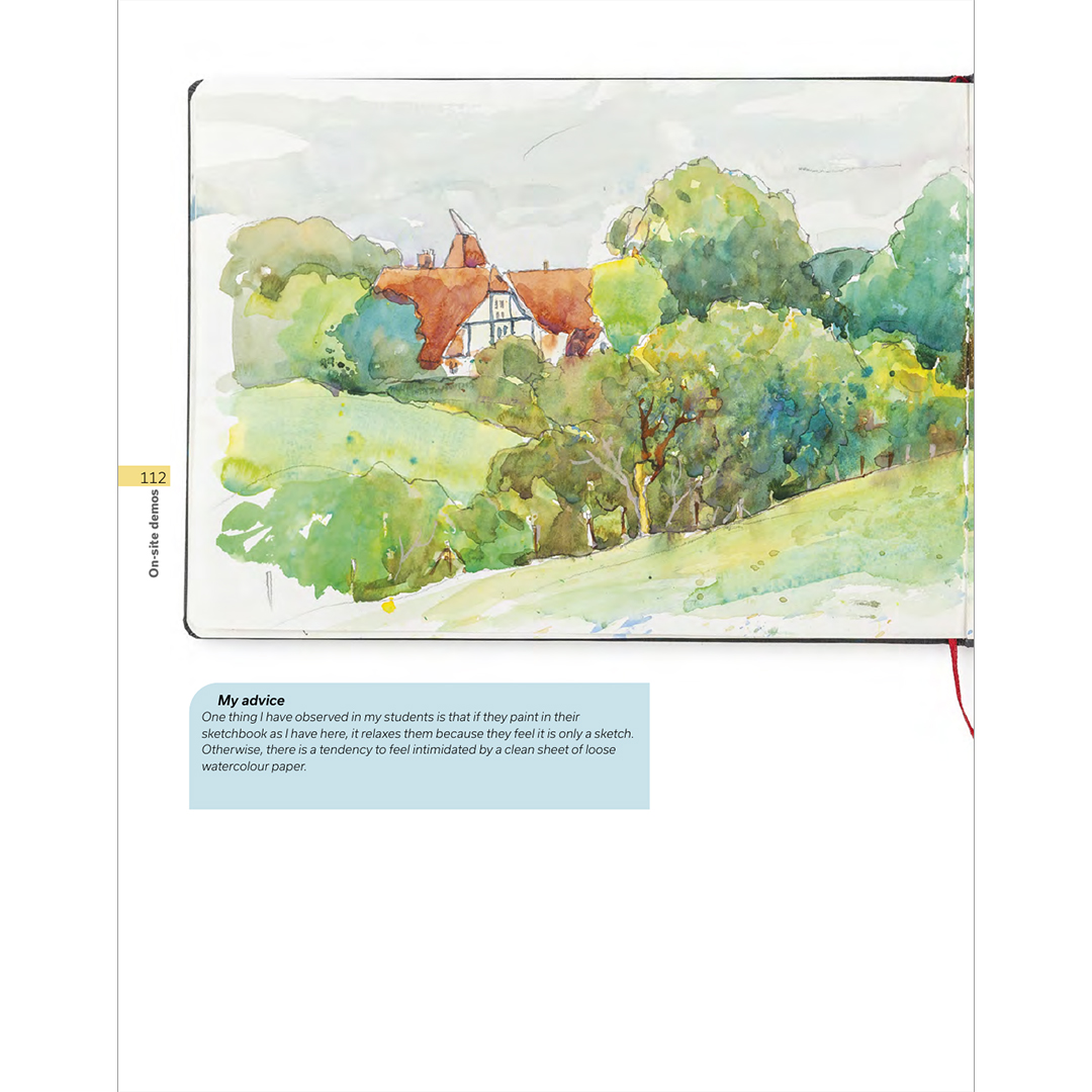 This is a handy book you’ll want to keep close by again and again. It’s full of inspiring artwork and contains five demonstrations: a coastal scene in ink; a countryside panorama in watercolour; a quintessential English village in gouache; a townscape in line and watercolour wash; and trees in watercolour pencils.