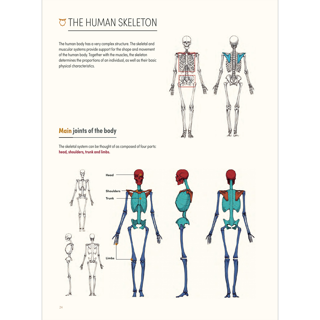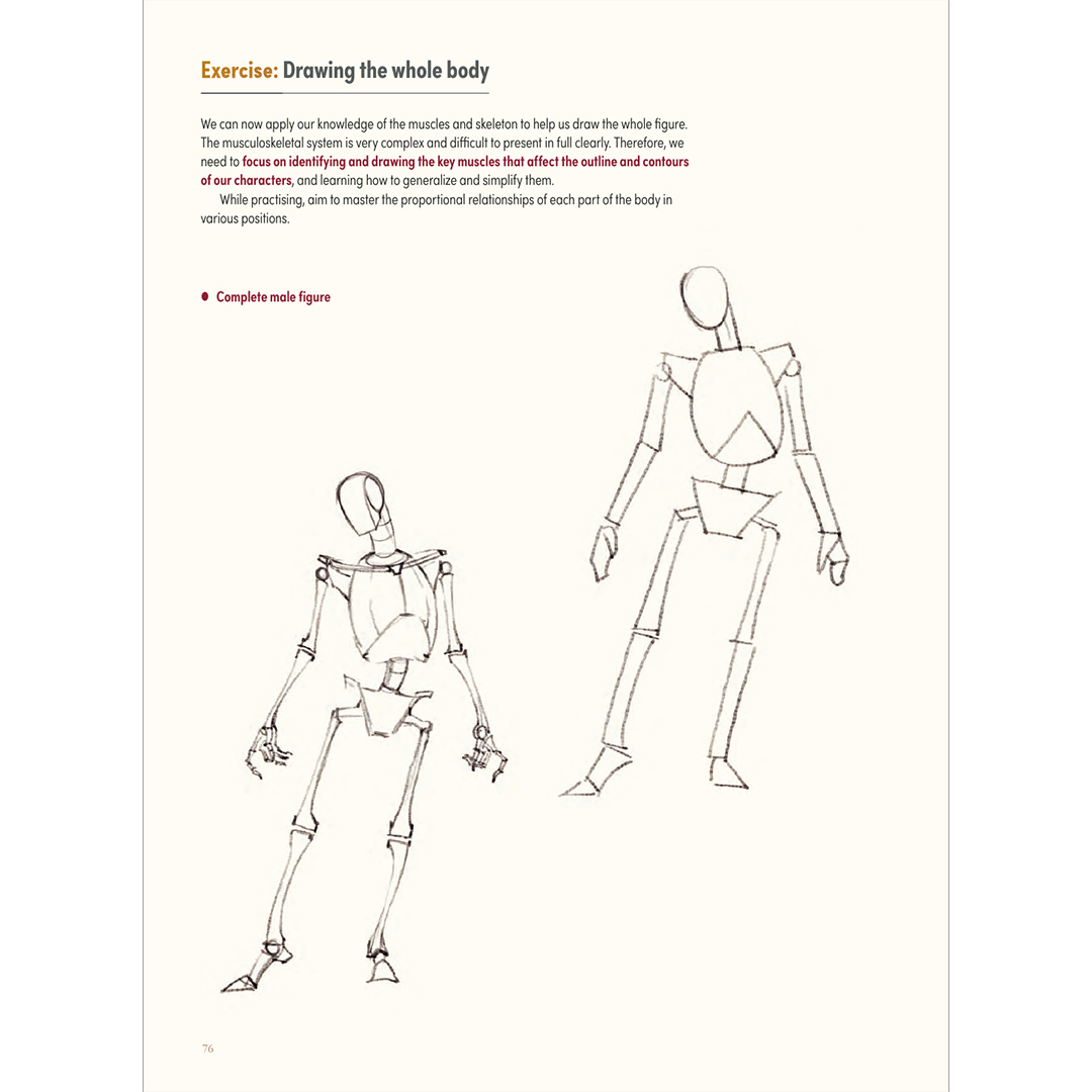 Human anatomy and kinetics: Understand the structure and movement that serve as the foundation for all character design. The skeletal and muscular systems are explored in a number of ways, from traditional musculo-skeletal illustrations to line and cube forms. Also included is a guide to creating hands, feet, limbs and facial features full of character and expression.