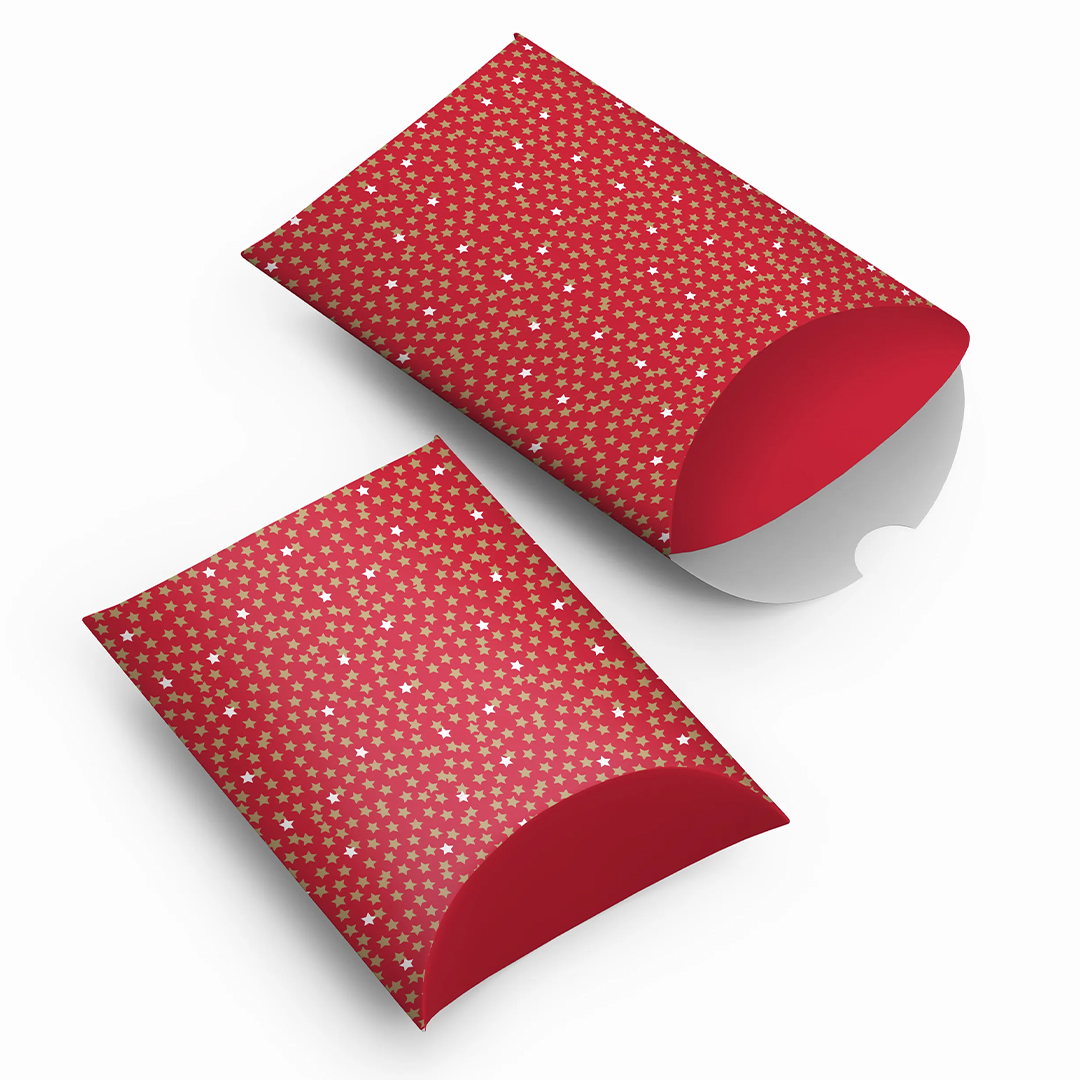 DESIGN: small stars on a red background, a gift box with sparkling patterns, ideal for wrapping a Christmas or birthday present.