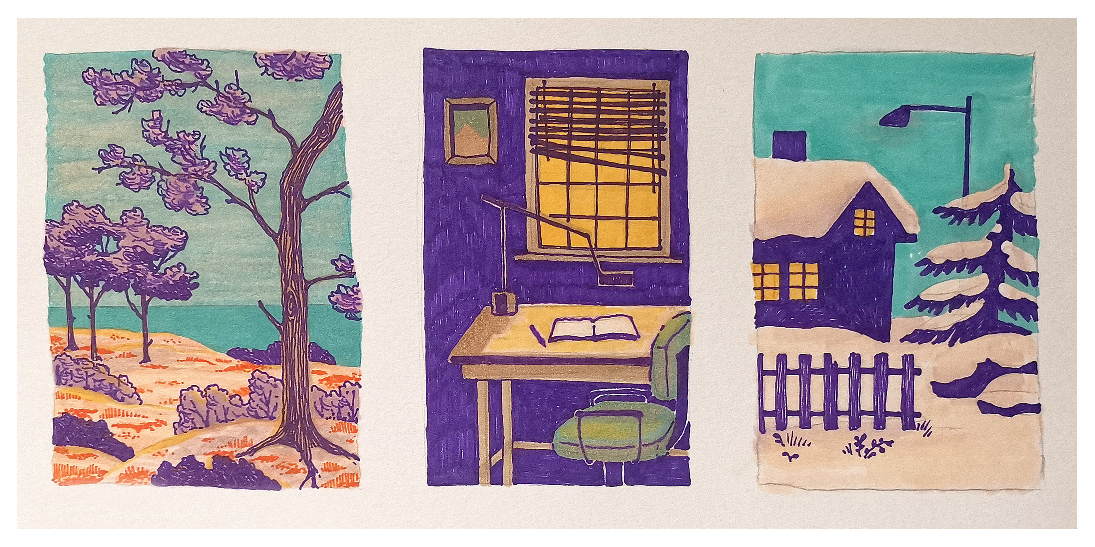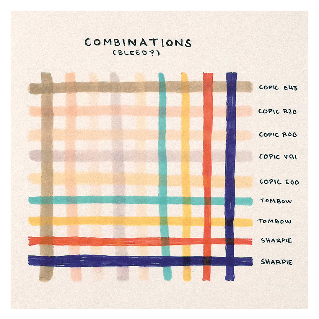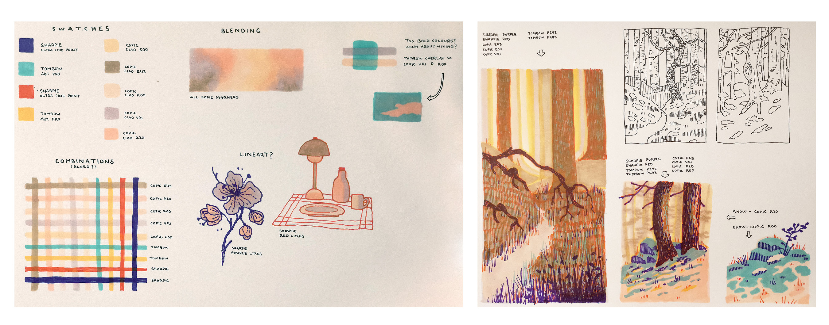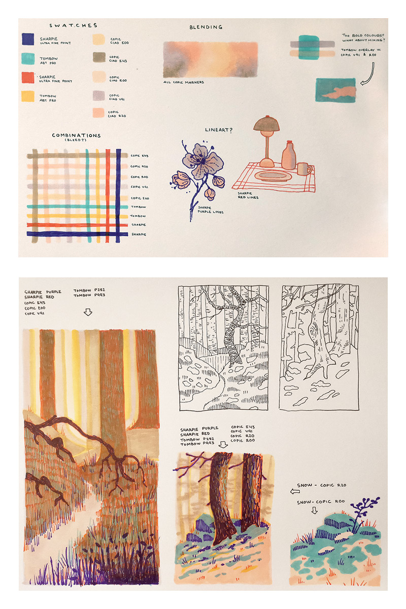 Once I have familiarised myself with the pens and their colours, I continue by drawing small sketches and thumbnail studies to test different colour combinations within a larger composition.
