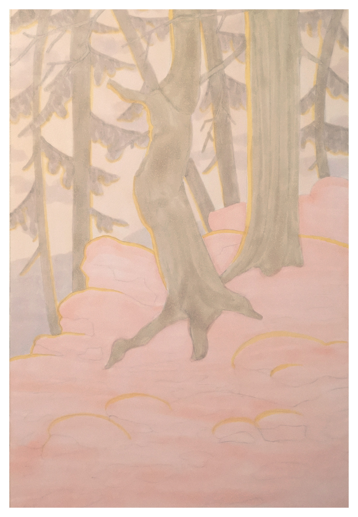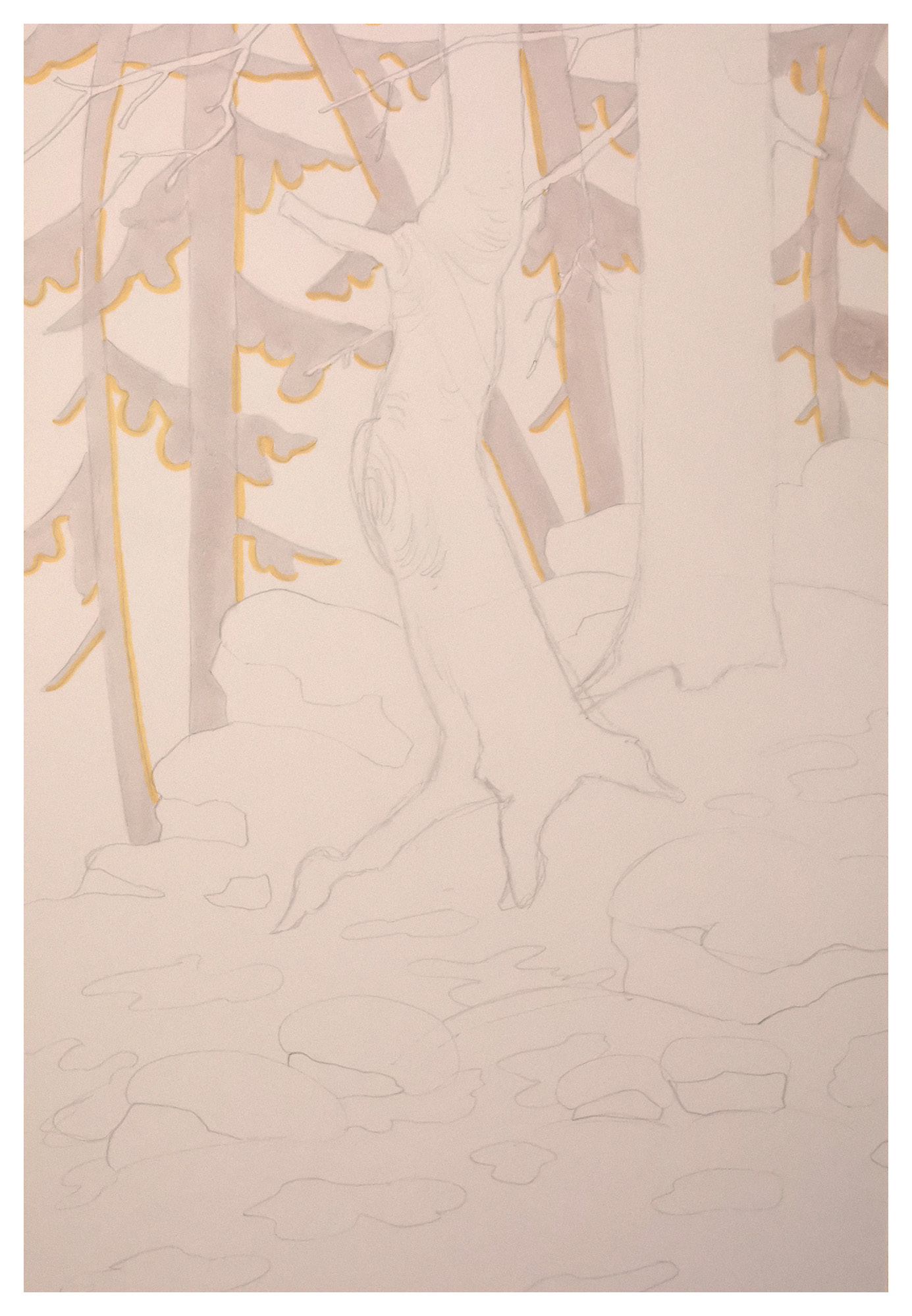 I began by laying down the base for the trees and the snow with light shades of pink and beige. I also used yellow to give the trees a hint of sunlight.