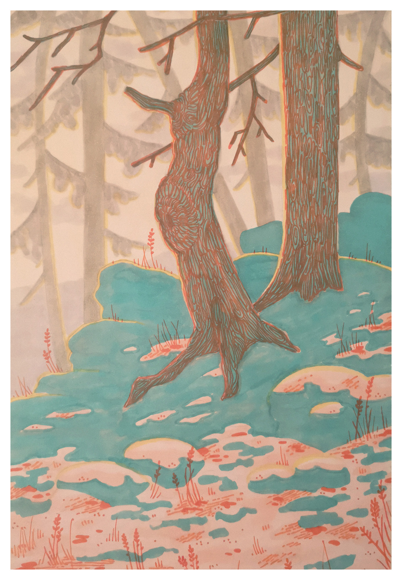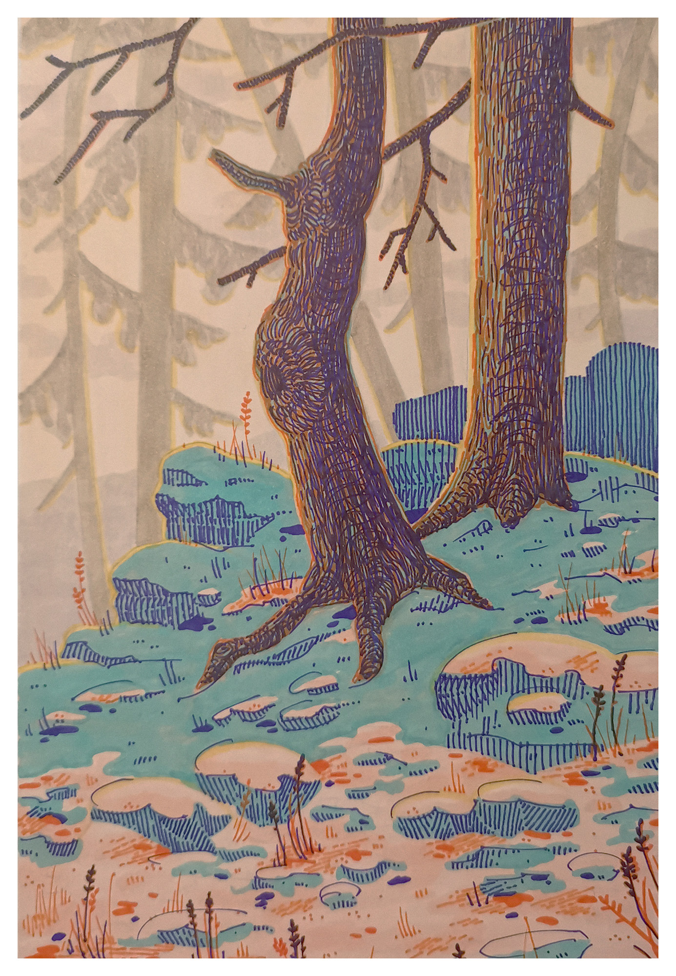 I then outlined the contours of the snow in turquoise and added details in red. Finally, I finished the last details and shadows in purple. The red and purple tones helped give the illustration texture and additional detail.