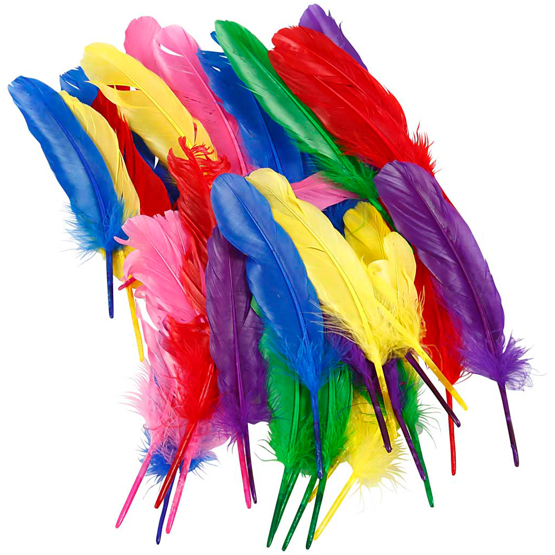 Pack of 36 coloured chicken feathers in 6 different colours, perfect for decorations, masks, Easter crafts and other creative DIY projects. At about 20 cm in length, the feathers are just the right size for both children and adults to work with and easy to glue, tie or attach to various materials.