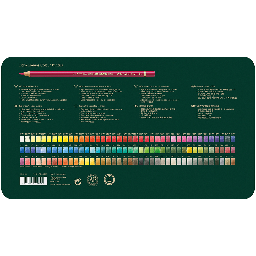 With high-quality, acid-free pigments, Polychromos deliver unbeatable lightfastness that preserves colour brilliance for decades, alongside maximum break resistance, smudge and water resistance, and exceptional drawing characteristics.