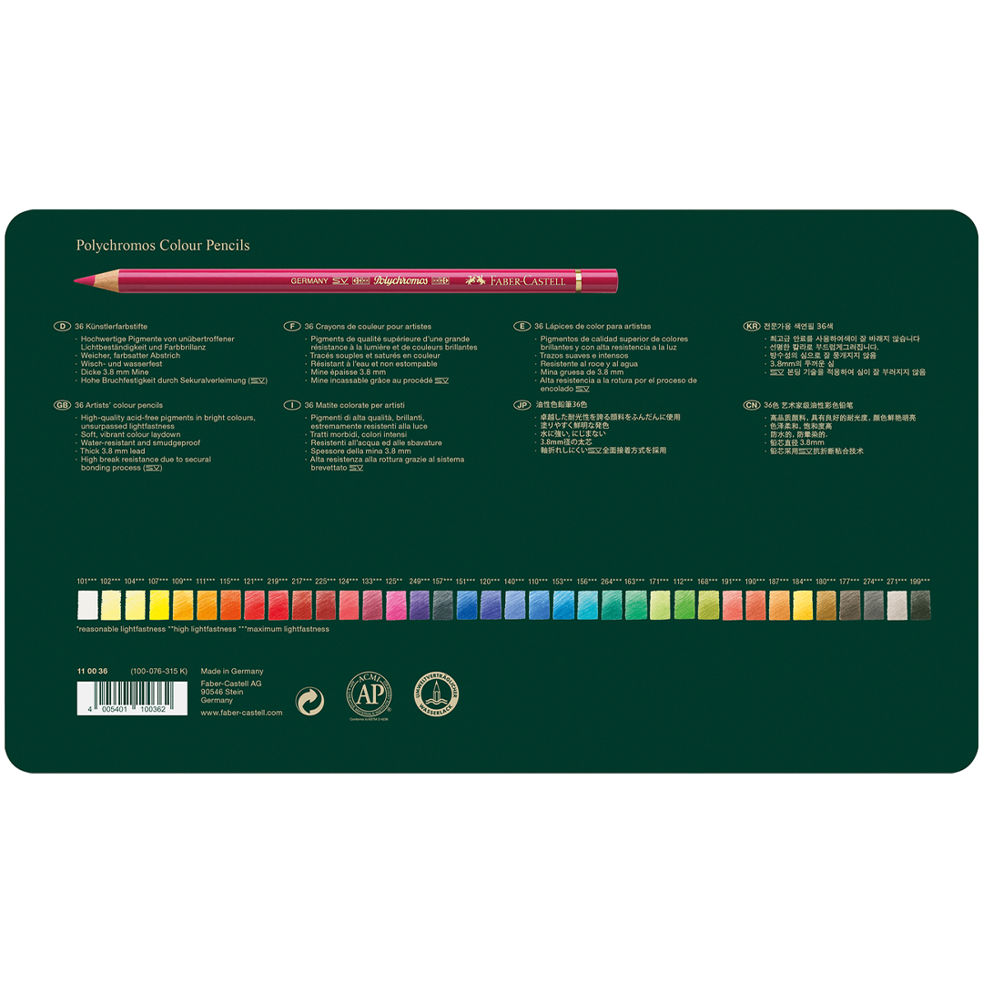 This set contains 36 Polychromos in various colours, packaged in a durable metal case.