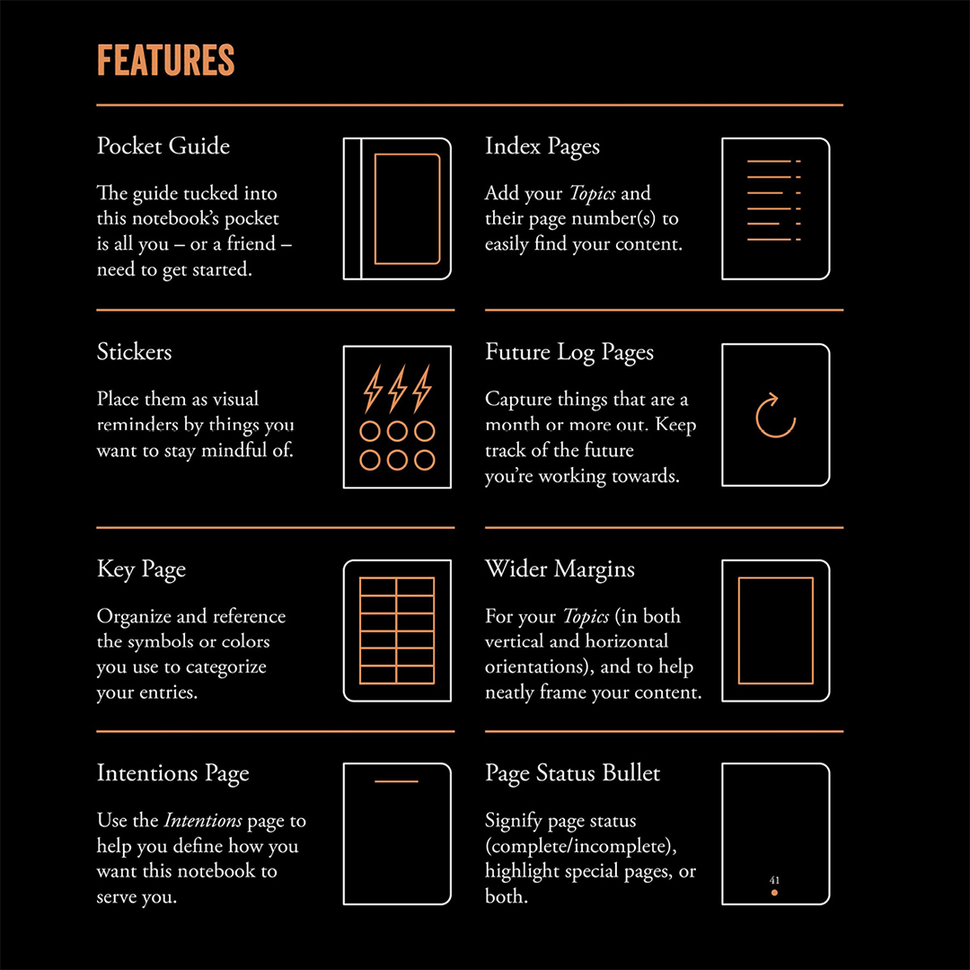 A separate guide with inspiration and tips for your bullet journal setup is included. Our tip is to complement your Bullet Journal A5 with the Bullet Journal Pocket, which fits in the book’s inner pocket (sold separately).