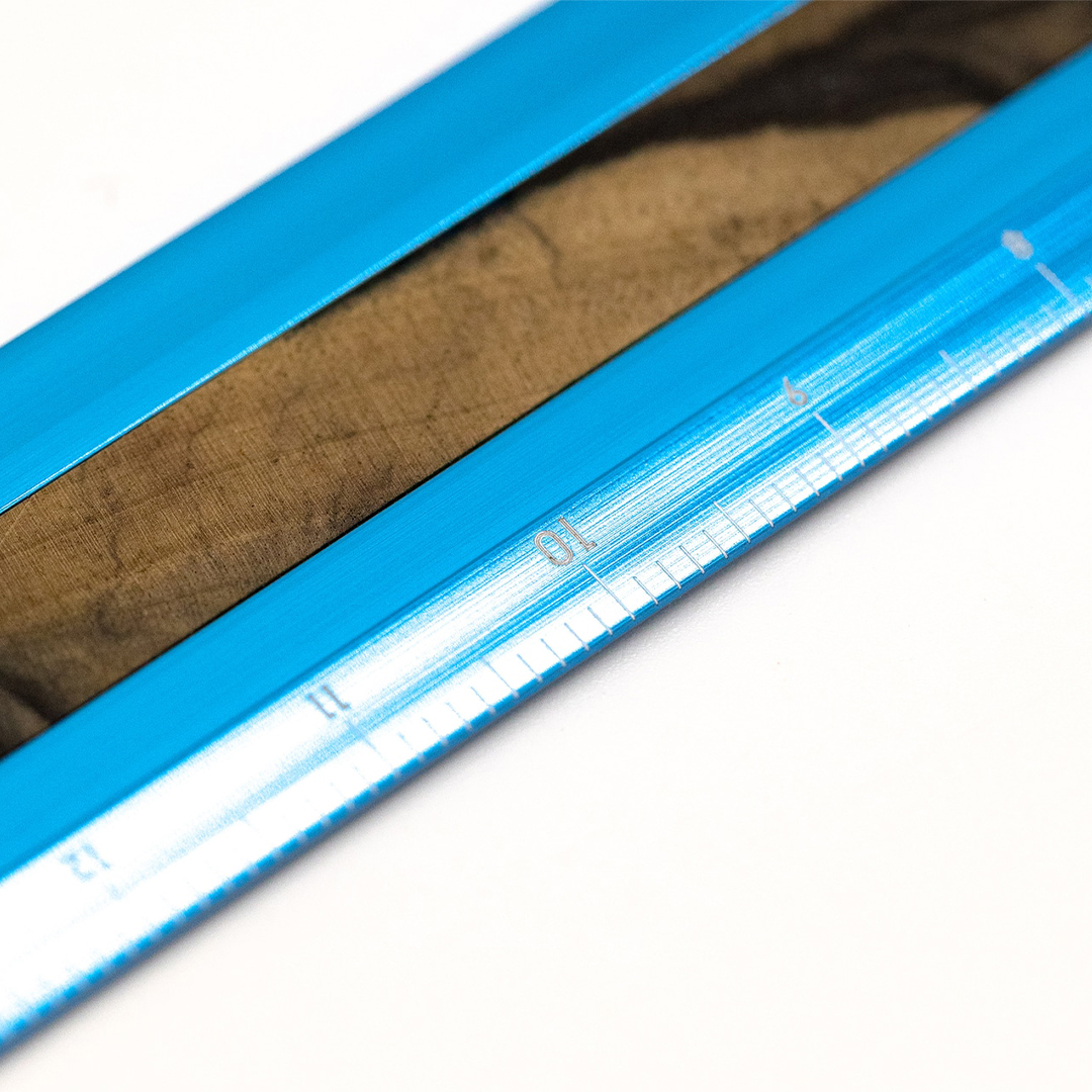 The ruler is beautifully embellished with a rare and highly prized wood known for its exceptional quality. This wood is often used for exclusive furniture, guitars, and other premium products where appearance and durability matter most. The combination of robust aluminium and exclusive wood gives the ruler a unique elegance.