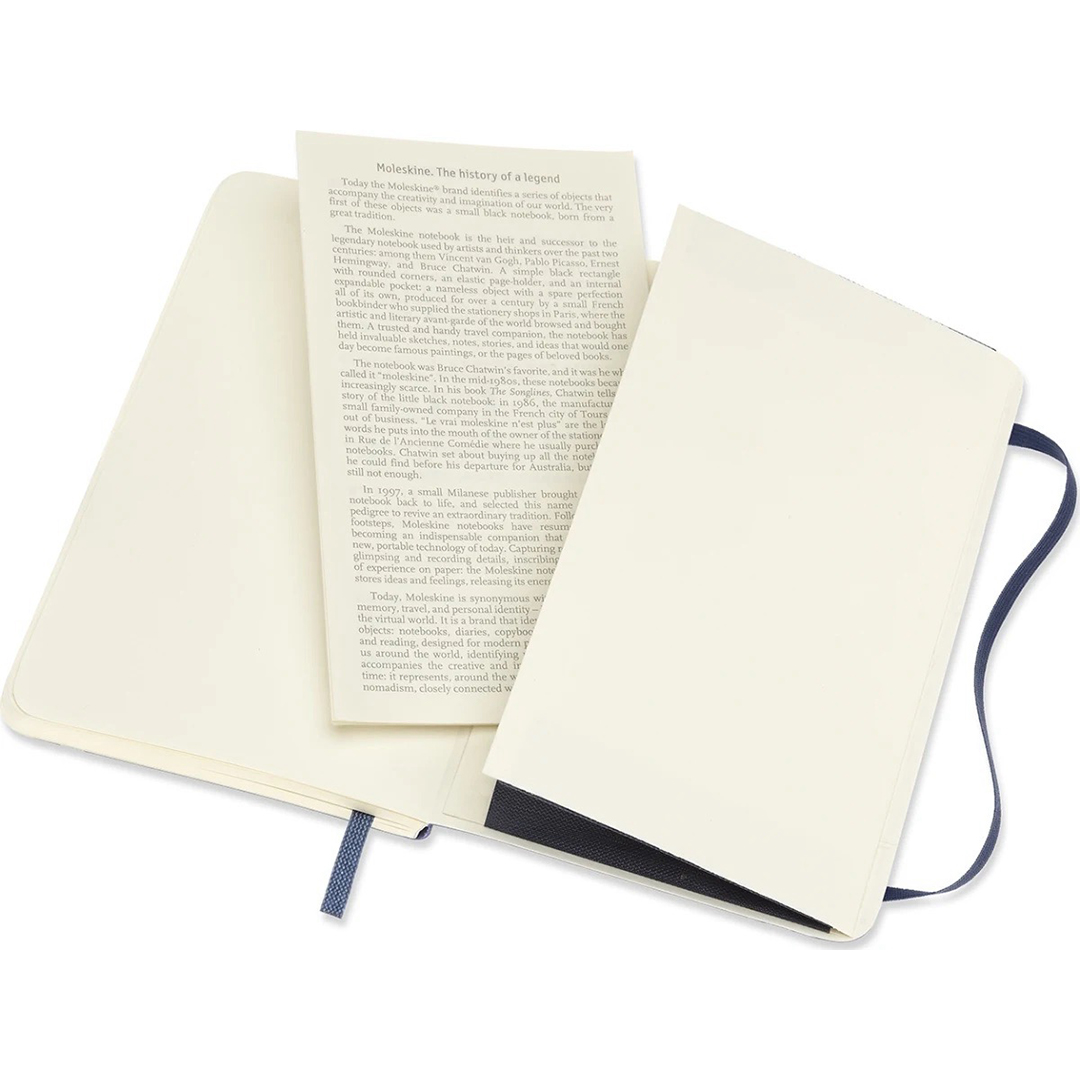 Notebook with a soft, flexible cover in Pocket size (9x14 cm) from Italian brand Moleskine. The notebook contains 192 pages and features an expandable inner pocket and an elastic band that keeps the notebook closed when not in use. The ivory-coloured paper is FSC-certified, acid-free, and of premium quality!