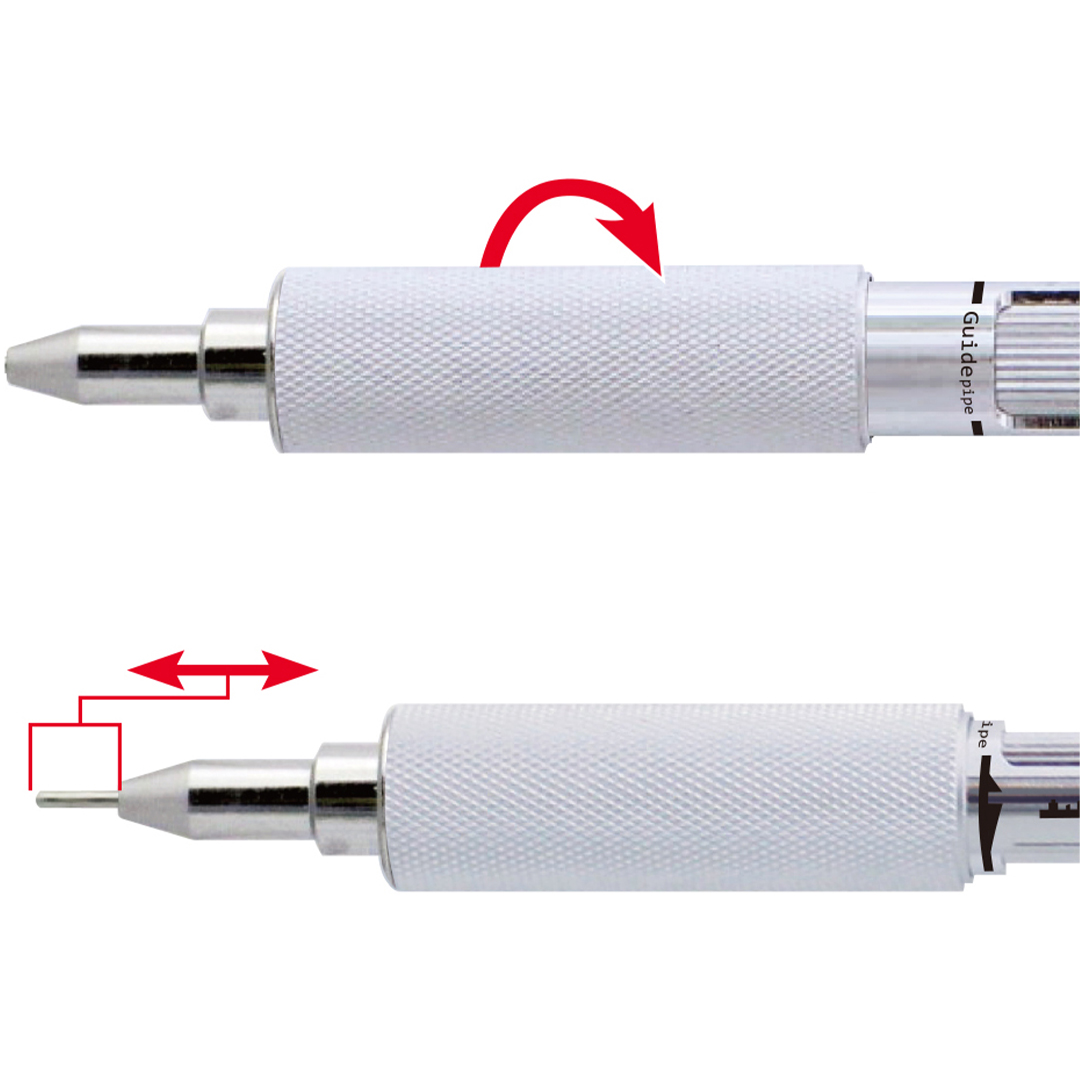 With the MS01, you can precisely adjust the length of the lead holder and how much lead is extended with every click. The lead holder can be adjusted from 0 mm to 5 mm by twisting the knurled grip section, and the amount of lead extended can be adjusted from 0.2 mm to 2 mm by twisting a section just above the grip. The barrel is made of aluminum and the grip section of brass, providing a sturdy and well-balanced feel.
