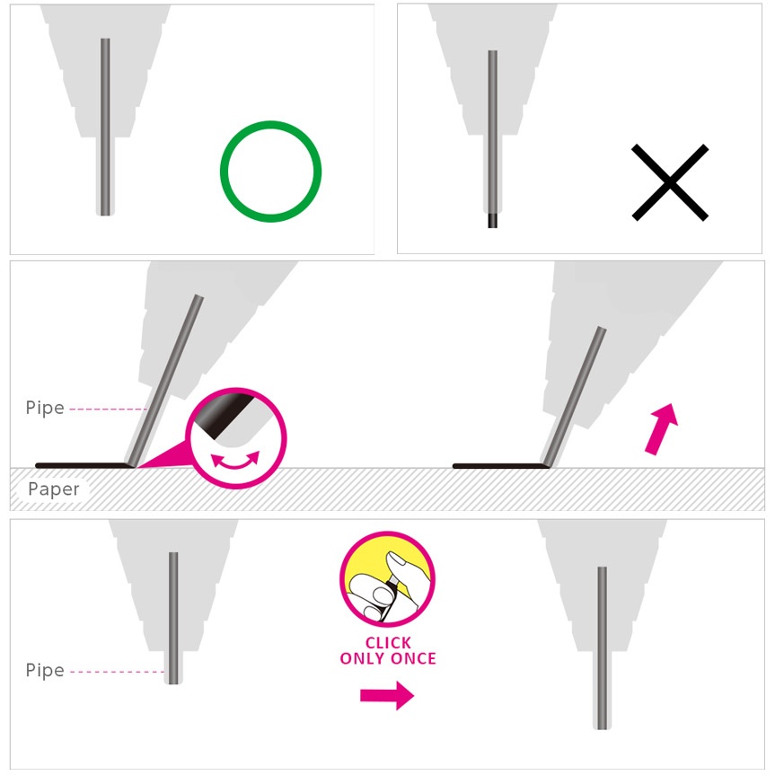 Before you start writing, click once so the lead becomes visible. Then hold down the push button while gently pressing the tip against the paper until the lead is hidden. Now you’re ready to write!
