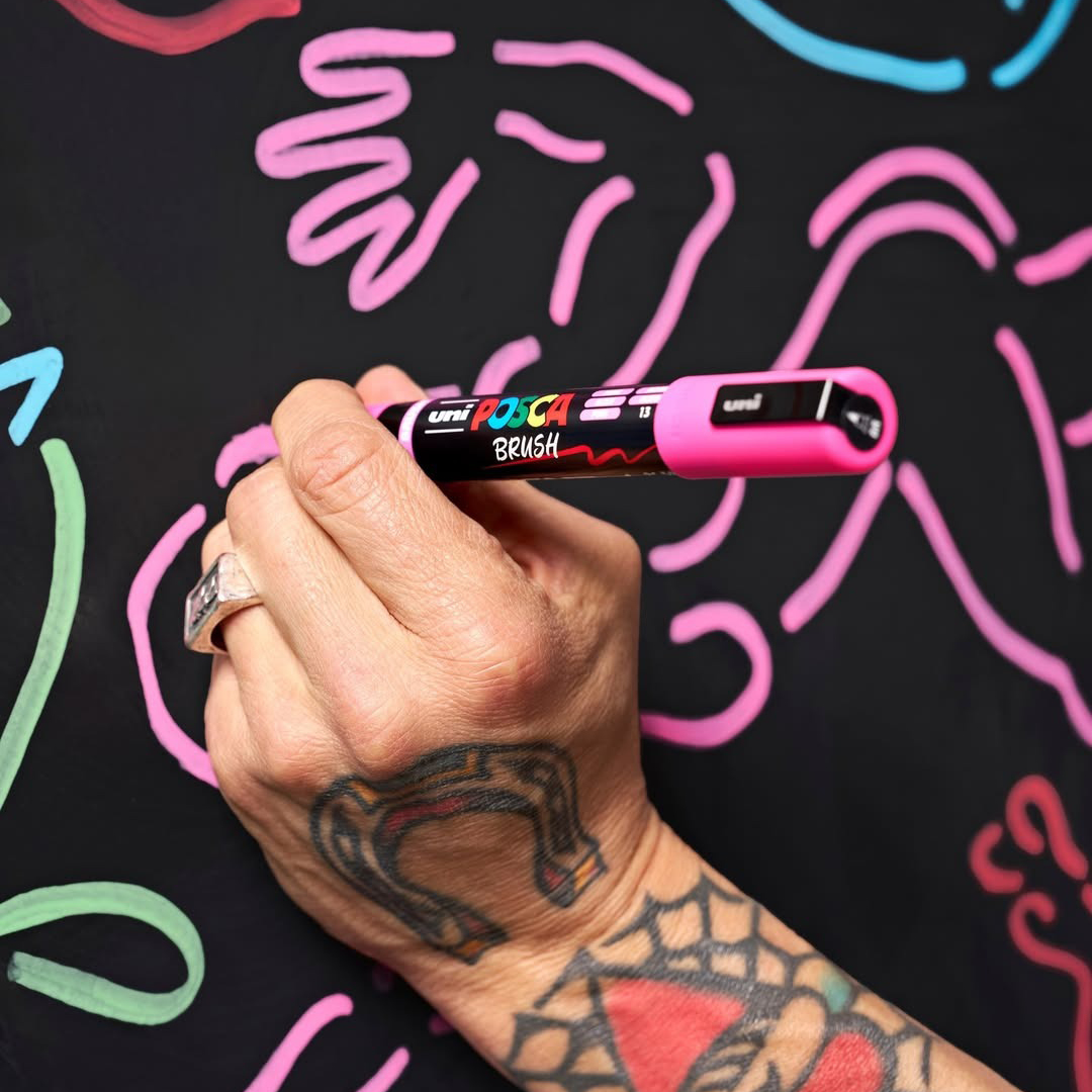 The Posca Brush is the latest addition to the iconic Posca family, a cult favourite among creators all over the world. From street art to school projects, from professional illustrators to DIY fans, Posca is used by makers of all ages and styles. With a wide range of tips and colours, there’s a Posca for every idea – and now also with a semi-flexible brush tip!