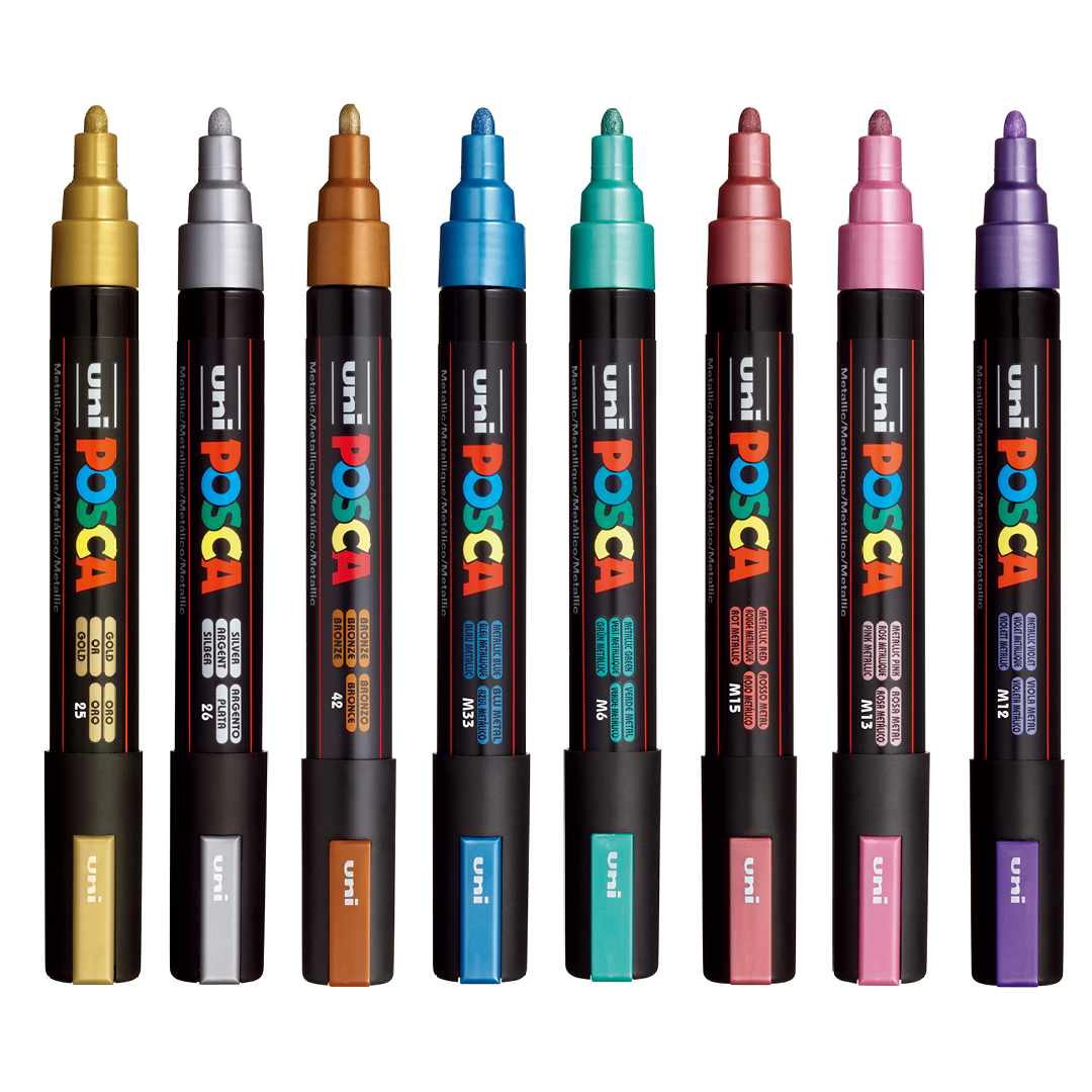 This set contains 8 pens in size 5M 1.8 - 2.5 mm. Colors: Metallic Violet, Metallic Pink, Metallic Red, Metallic Green, Metallic Blue, Bronze, Silver, Gold.