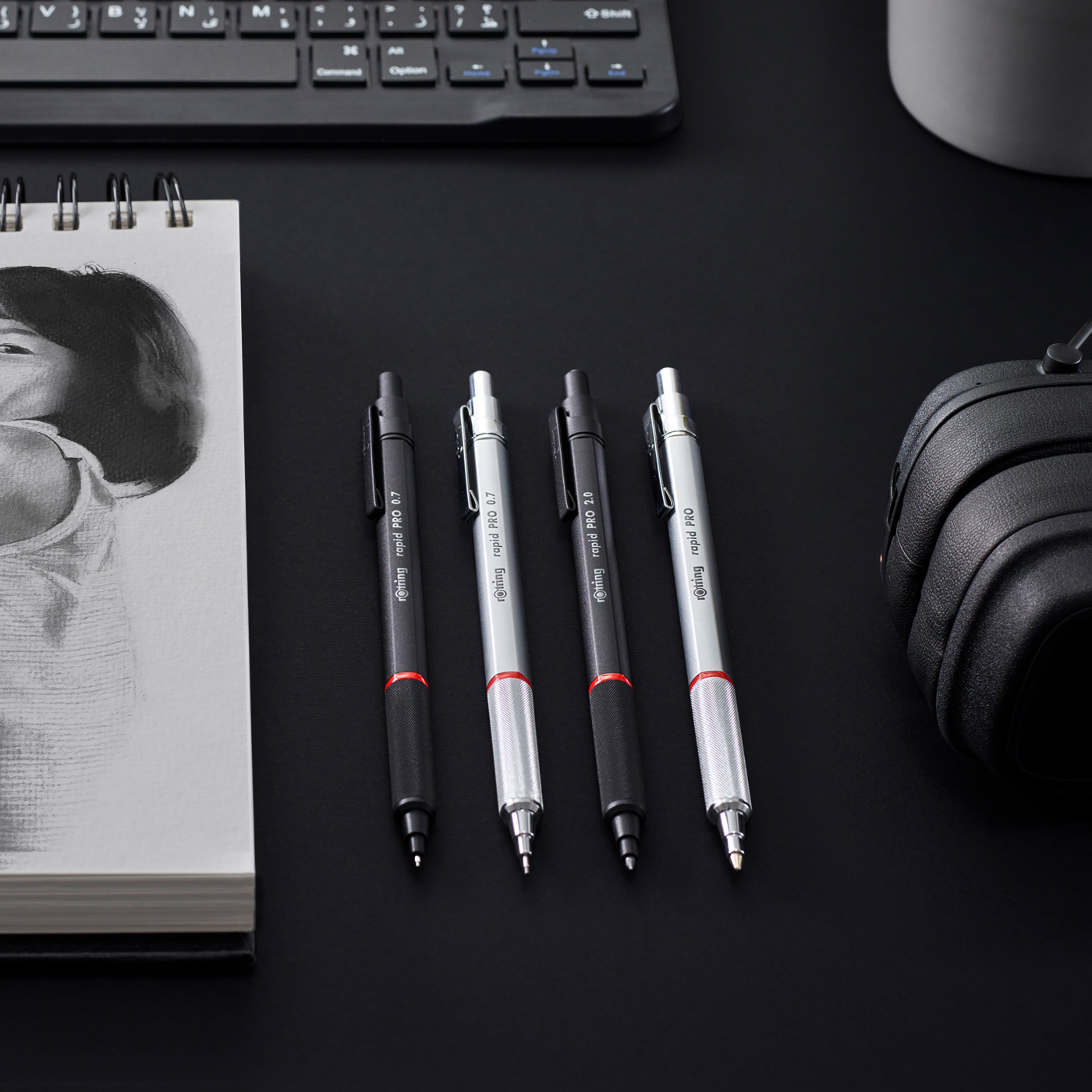 Rotring Rapid Pro ballpoint pen in matt black metal. Knurled grip. Removable metal clip. Refillable with Parker-standard refills. Supplied with medium tip, blue ink. Delivered in gift box.