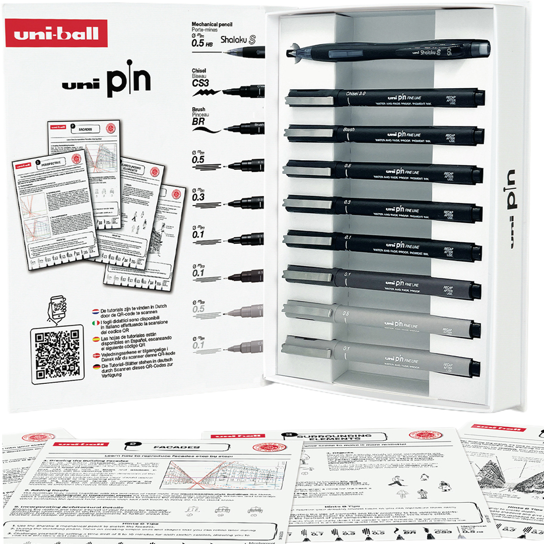 - 8 x Uni Pin Fine Line: Black 0.1 mm / 0.3 mm / 0.5 mm – Light Grey 0.1 mm / 0.5 mm – Dark Grey 0.1 mm – Black brush tip and chisel tip