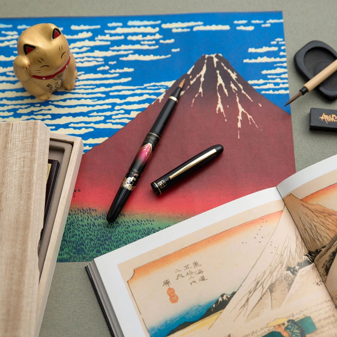 Kuretake Mannen Mouhitsu “Makie-Monogatari” is a luxurious series of refillable brush pens with traditional Japanese design inspired by maki-e, the exquisite lacquer art where gold and silver powder is applied in thin layers to create shimmering, deep patterns on dark surfaces. The powder consists of ultrafine flakes or granules from gold/silver leaf applied in lacquer and polished for a shimmering effect.