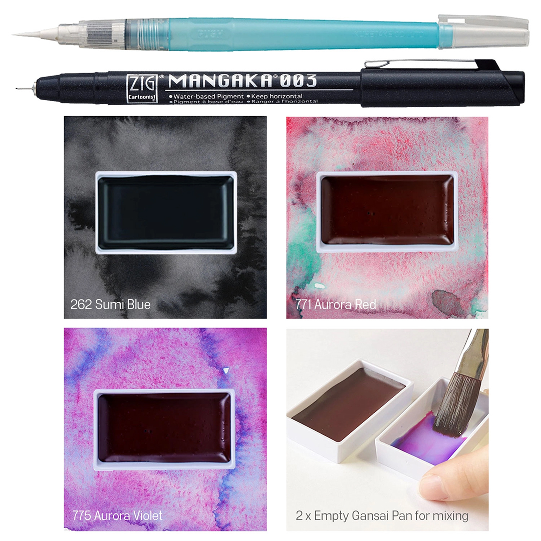 - 2 Gansai Tambi Granulating colours: Aurora Red (771) / Aurora Violet (775)
